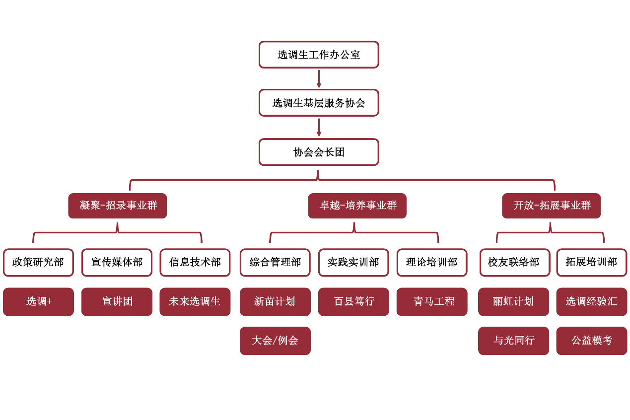 协会内设综合管理部、政策研究部、实践实训部、理论培训部、校友联络部、宣传媒体部、拓展培训部、信息技术部8个职能部门,并在此基础上形成目标导向、部门协同、特色鲜明、矩阵灵活的凝聚-招录事业群、开放-拓展事业群和卓越-培养事业群3个事业群,由协会会长团统筹管理。