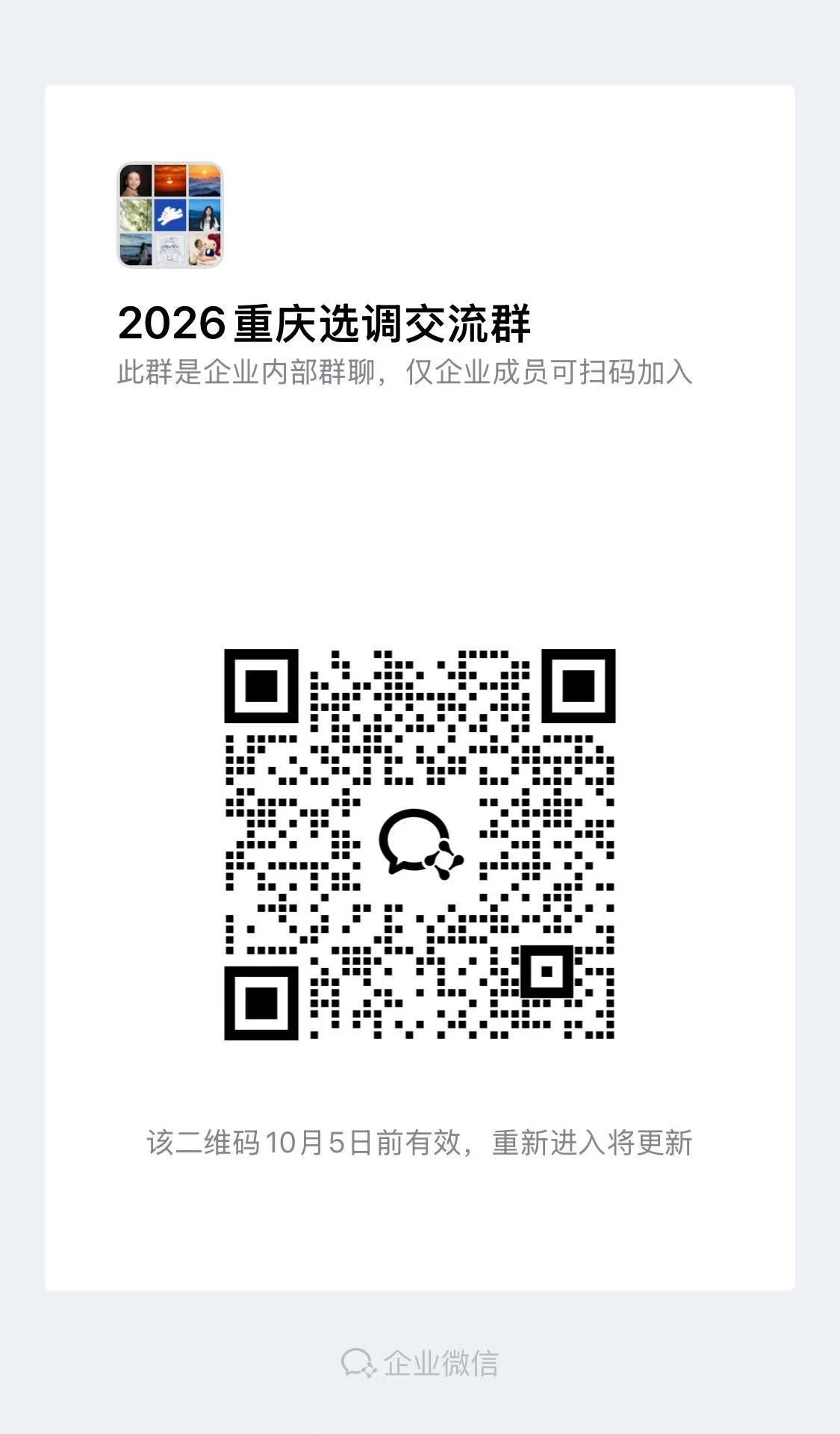 1.扫描本公告的二维码,进入“2026重庆选调交流群”企业微信群,若二维码失效,请添加工作人员微信:zhs15000788309,备注“学院+姓名+重庆急需紧缺专业选调”。