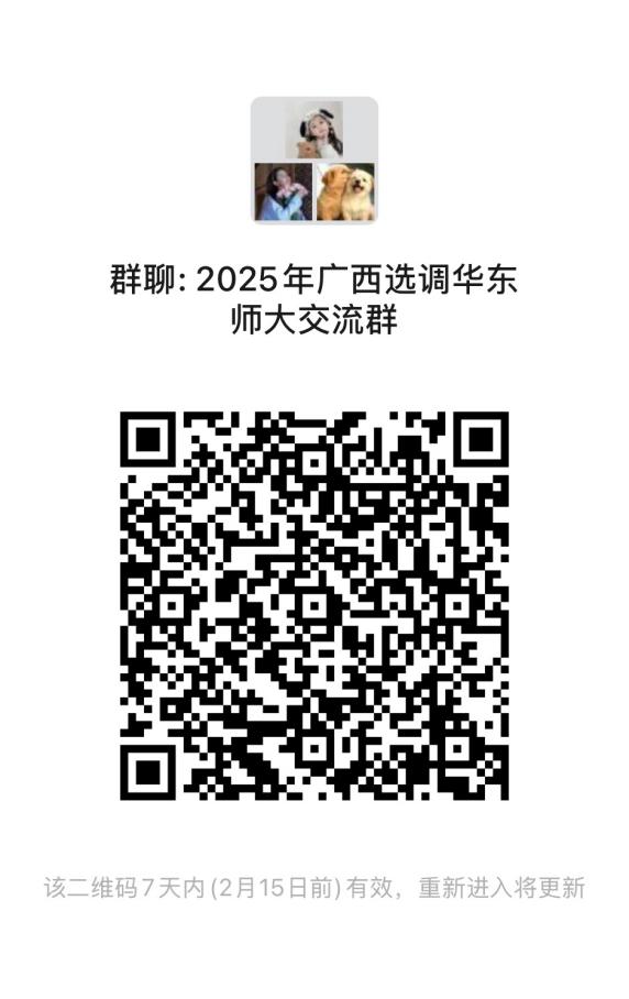 步骤1:扫描本公告的二维码,进入“2025年广西选调华东师大交流群”。(如二维码失效,请添加工作人员微信:13961710323,并备注“姓名-院系-广西选调优秀大学毕业生”)