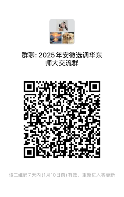 步骤1:扫描本公告的二维码,进入“2025年安徽选调华东师大交流群”。(如二维码失效,请添加工作人员微信:13961710323,并备注“姓名-院系-安徽选调”)
