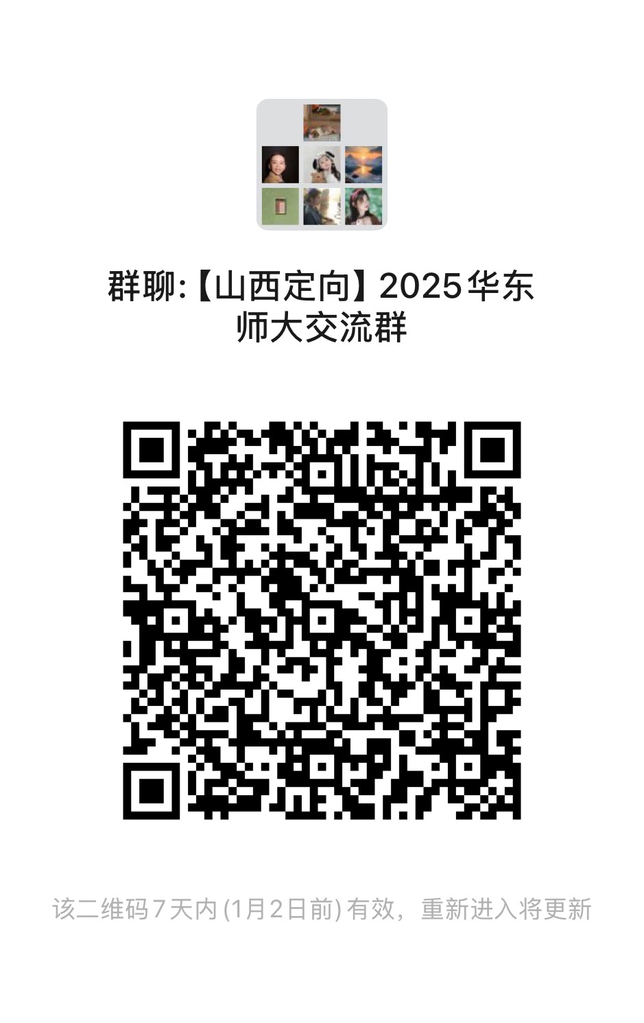 步骤1:扫描本公告的二维码,进入“【山西定向】2025华东师大交流群”。(如二维码失效,请添加工作人员微信:sch22323,并备注“姓名-院系-山西定向选调”)