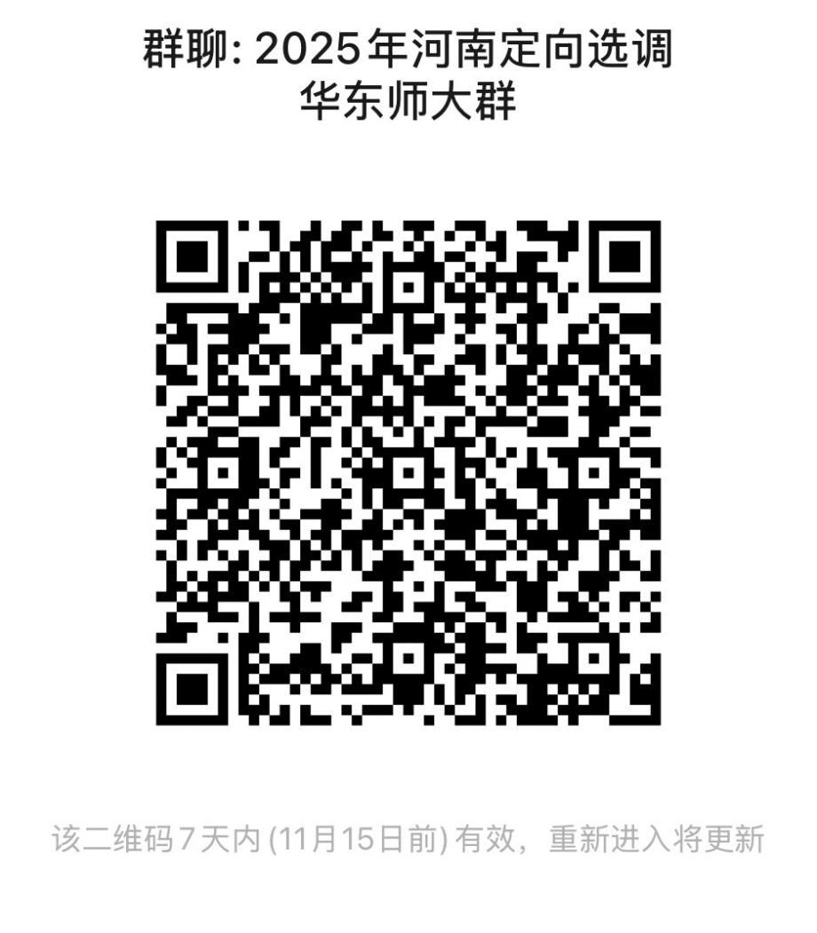 步骤1:扫描本公告的二维码,进入“2025年河南定向选调华东师大群”。(如二维码失效,请添加工作人员微信:Shenyizhen2,并备注“姓名-院系-河南定向选调”)