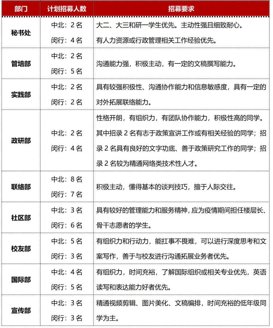 各部门招募计划