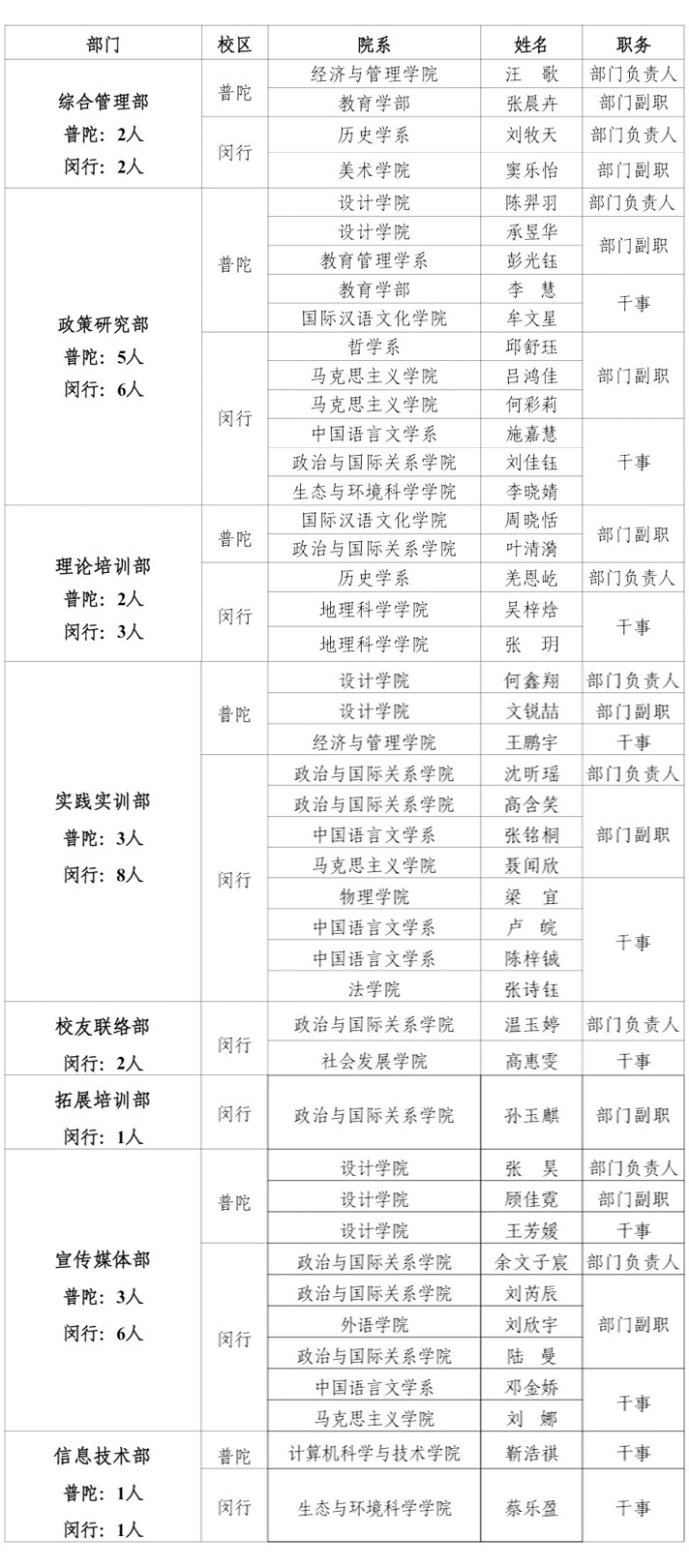 根据协会春季纳新竞聘工作方案,通过个人报名、材料审核、考聘面试等程序,并经指导老师、会长团、综合管理部及各部门负责人研究决定,汪歌等45名同学考聘成功,现公示如下: